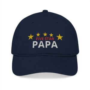 This organic baseball cap embroidered with a cheerful five‑star design reads “FIVE STAR POPPY,” giving it a playful, proud personality. Poppy is a popular nikcname for Grandpa. Poppy will wear this comfortable hat with pride and joy! Soft, medium‑weight organic cotton and a low‑profile, unstructured six‑panel shape create a relaxed, lived‑in look that sits comfortably on the head. The embroidered stars and textured lettering add handmade warmth — like a tiny trophy you can wear every day. Subtle matching eyelets keep it breezy, while the self‑fabric adjustable strap with a brass slider lets you tuck the excess for a neat finish. Sustainably produced and certified (OCS & GRS), this cap feels good to wear and to give — whether you’re cheering from the sidelines, visiting family, or simply running errands with someone special.